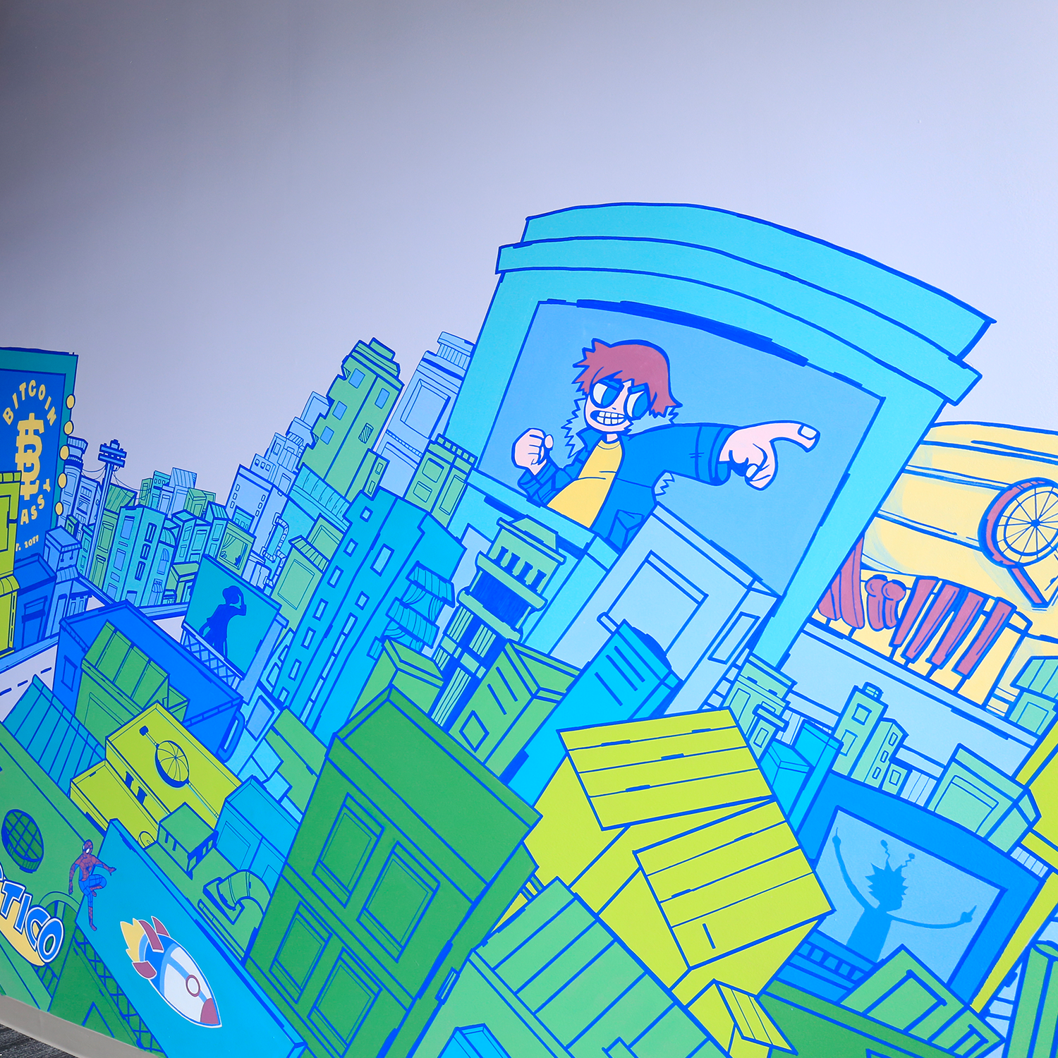 Mural hecho con pintura vinílica y delineado con marcadores Mololtow para las oficinas de Tauros ubicados en la Torre Mitikah, Coyoacán, CDMX.