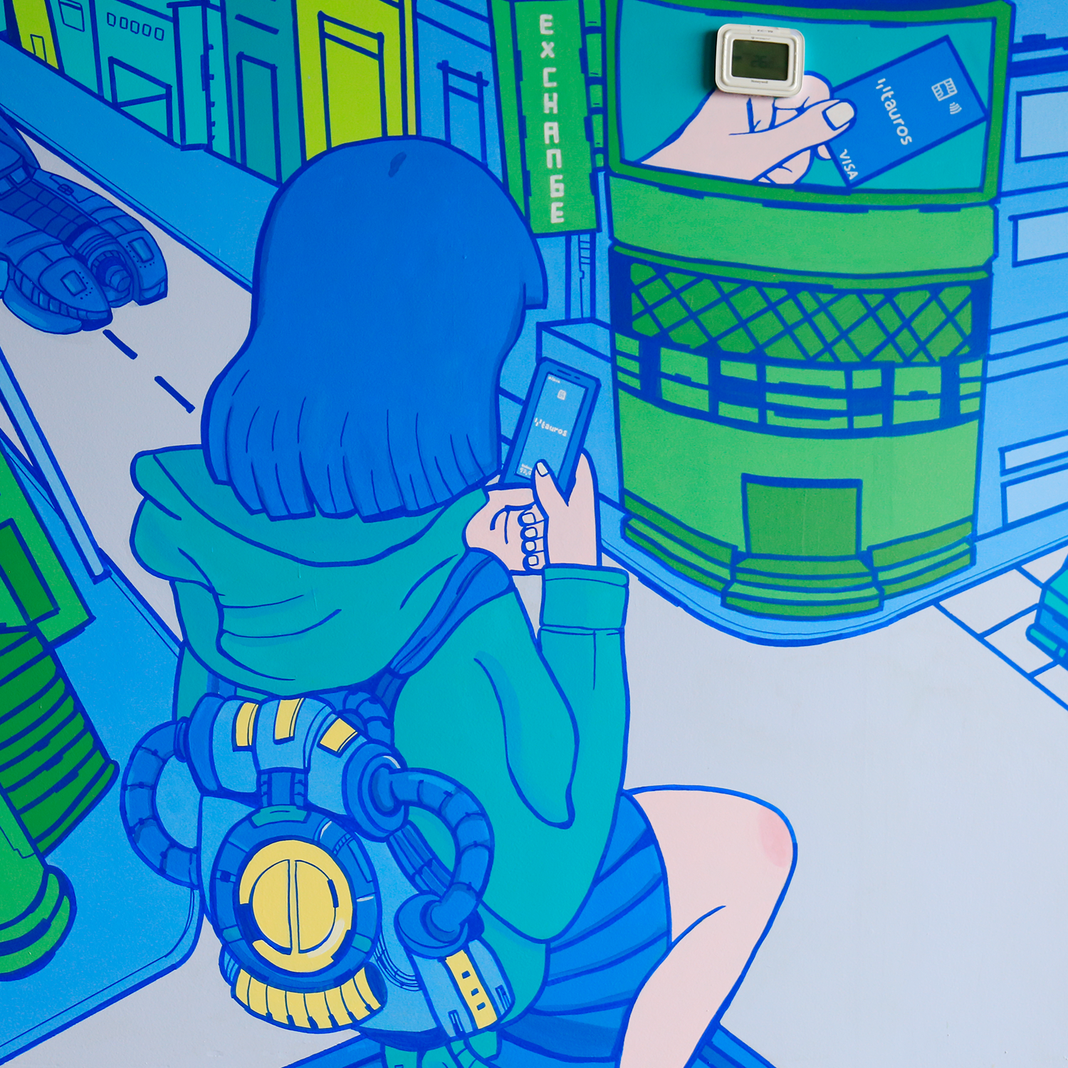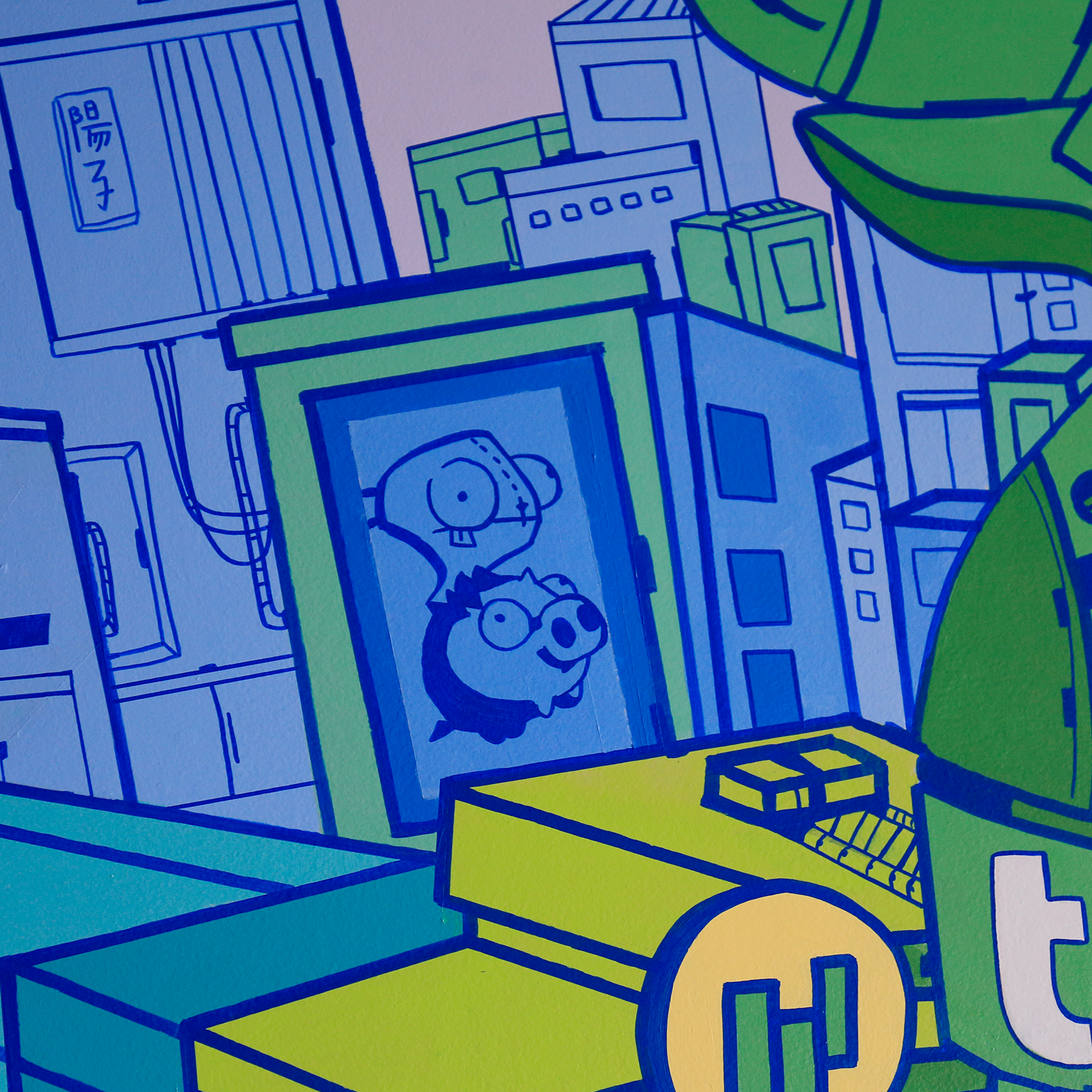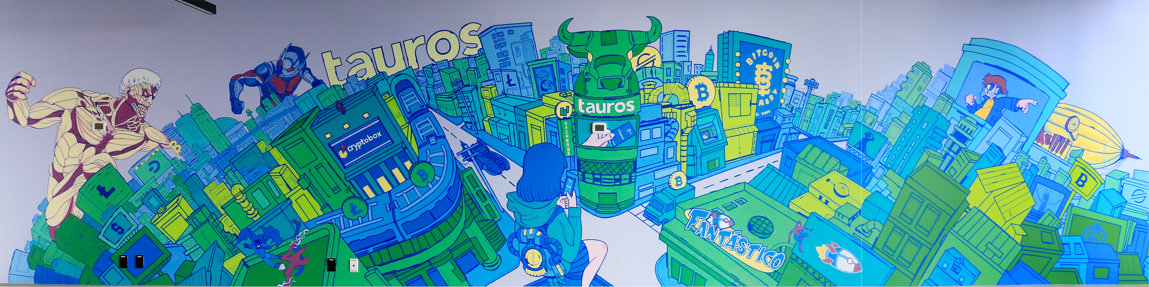 Mural hecho con pintura vinílica y delineado con marcadores Mololtow para las oficinas de Tauros ubicados en la Torre Mitikah, Coyoacán, CDMX.